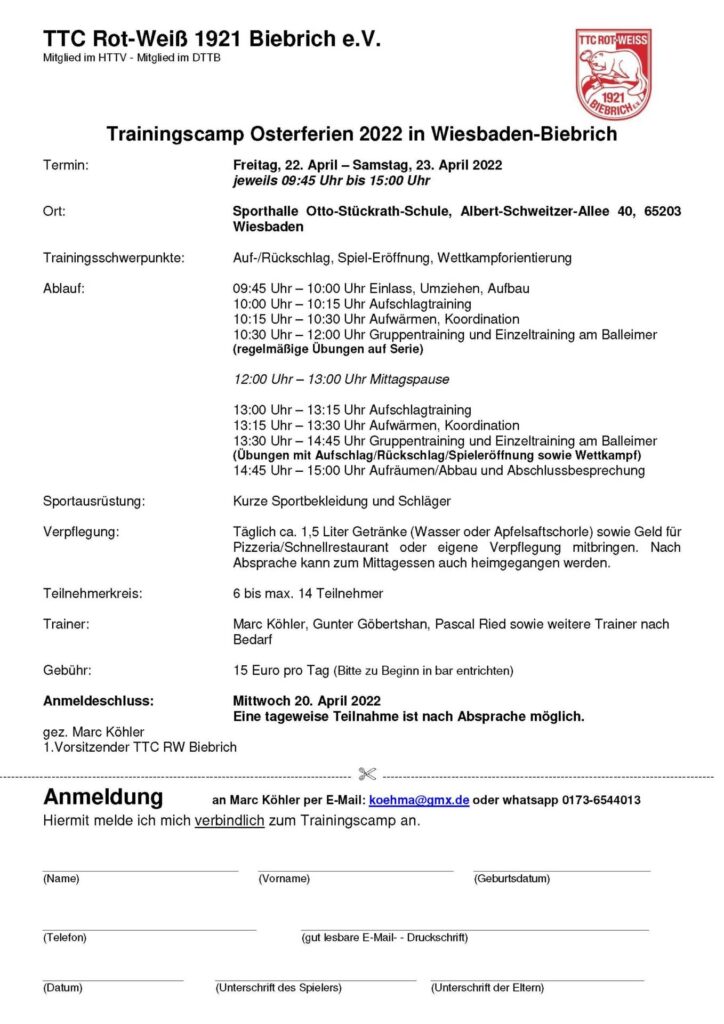Am 22. und 23. April wird in der Sporthalle der Otto-Stückrath-Schule wieder ein Ferienlehrgang (Trainingscamp) für den Nachwuchs angeboten. Dies ist auch eine gute Möglichkeit zur Vorbereitung auf die eine Woche später anstehenden Kreisranglisten, die wir austragen.