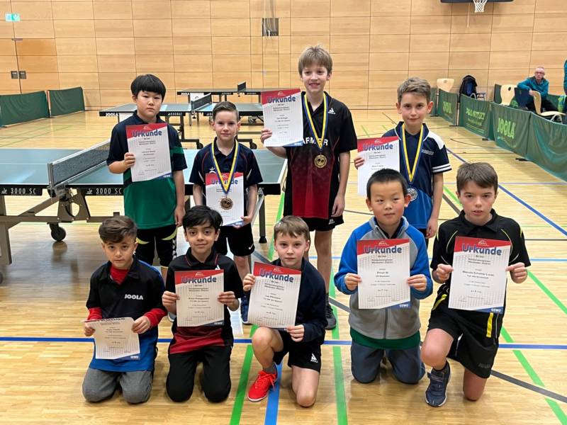 Bei den Jungen 11 gewann Tim Ehlinger in seinem ersten Turnier ohne Niederlage sensationell die Goldmedaille. Bei eine Bilanz von 6:0 Spielen musste er zweimal über die komplette Distanz von 5 Sätzen gehen, behielt aber beide Male die Nerven. Er qualifizierte sich damit für die Bezirksvorrangliste im Mai. Auch Leo Pfirrmann auf Platz 6 und einer Bilanz von 3:3-Spielen sowie Arjun Padegaonkar auf Platz und 2:4-Spielen zeigten in Ihren erstem Turnier tolle Leistungen.