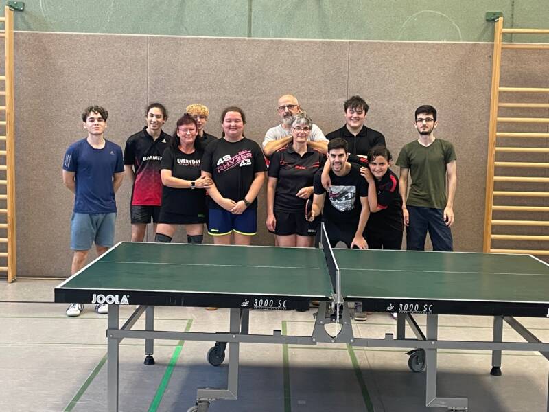 Unsere Vereinsmeisterschaften fanden wie in jedem Jahr am 03. Oktober (Tag der Deutschen Einheit) statt. Um 13.30 Uhr starteten die Erwachsenen. Gespielt wurde ein Zweier-Mannschaftsturnier mit insgesamt 6 Teams. Die Teams wurden im Losverfahren zusammengestellt, wobei den 6 nominell stärkeren Spieler:innen (QTTR-Punkte) jeweils ein Partner zu gelost wurde. Gespielt wurde “Jeder gegen Jeden” mit je einem Einzel pro Spieler:in (1 – 1, 2 – 2) und einem Doppel. Jede:r Spieler:in hatte damit 10 Matches zu absolvieren. Neben den Erwachsenen nahmen auch vier Jugendliche teil, die eine Erwachsenen- Spielberechtigung haben, , so dass die Altersspanne der Teilnehmer:innen von 12 bis 65 ging.